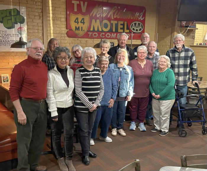 Class dinner at Arni's Restaurant in Lebanon on Mar. 18, 2026. Back row: Carolyn Jane Phillippo, Norma Kincaid Sanders, Dianna Vanlandingham Ferguson, Bruce Snodgrass, David Truitt, John Trips, Tony Hedge. Front row: Alan Cragun, Grace Cragun, Dana Brown, Linda Delpha, Rena Russell, Carol Ann Janow, Linda Trent.